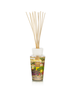 The Provence candle and its 500 ml fragrance diffuser are inspired by a free and vibrant drawing that pays tribute to the iconic landscapes of the South and to the colorful imagination of DavidHockney, who painted Provence as a luminous patchwork.The decor, conceived as a poetic cartography, brings together emblematic places. Among the mare the Baux-de-Provence perched on their rocky spur, the Abbey of Sénanque nestled among lavender fields and cypress trees, Provençal farmhouses bathed in light, the bridge of Avignon and the elegant lines of the Château de Lourmarin. Everything responds, overlaps and stretches like the pages of a travel diary, where each page is a stage to visit and an emotion to capture.The deliberately playful and almost naïve aesthetic plays with Hockney’s graphic codes, with bold colors, vibrant flat areas and a free perspective.The landscape becomes a painting, a joyful puzzle where the eye wanders. Flamingos in the foreground add an unexpected and light touch and nod to the wetlands of the Camargue
